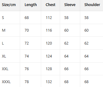 Sizes: S, M, L, XL, XXL, XXXL.